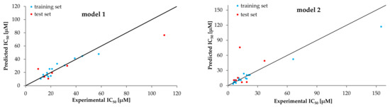 The statistical quality predictive ability of the QSAR models was evaluated using the coefficient of determination R2 and modified coefficients R2adj and Q2Loo. Additionally, for each model, the residuals were normally distributed. The minimal value of the parameters were: R2adj greater than 0.85 and Q2LOO greater than 0.72, where, in the test set for each model, there was a minimum of 25% compounds.