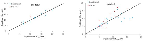 Scatter plots for N-(imidazolidin-2-ylidene)benzenesulfonamides 20–44 (model 1), N-(1-benzylimidazolidin-2-ylidene)benzenesulfonamides 45–73 (model 2) and N-[1-(4-fluorobenzyl)imidazolidin-2-ylidene]benzenesulfonamides 82–101 (model 3), as well as N-[1-(3-trifluoromethylbenzyl)imidazolidin-2-ylidene]benzenesulfonamides 112–117, N-[1-(4-trifluoromethylbenzyl)imidazolidin-2-ylidene]benzenesulfonamides 118–143 and N-{1-[3,5-bis(trifluoromethyl)benzyl]imidazolidin-2-ylidene}benzenesulfonamides 144–157 (model 4) with experimental IC50 and predicted IC50 values of the training set (blue) and test set (red) for the HCT-116 cell line.