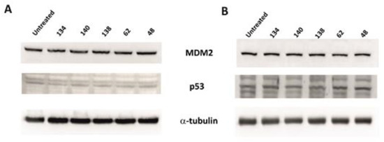 Structural analogs of the examined compounds were found to bind into the p53-binding pocket of the MDM2 protein. Thus, the effects of the examined compounds on the inhibition of MDM2-p53 interactions were examined. MDM2 and p53 protein levels were determined with Western blot analysis after the treatment of MCF-7 cells with compounds selected for their high selectivity index (48, 62, 134, 138, and 140). Compounds were examined at different concentrations (4 µM and 10 µM) following a 24-h incubation (Figure 7). Western blot analysis revealed no changes in either MDM2 or p53 levels, indicating that p53 stability does not change upon compound treatment.
