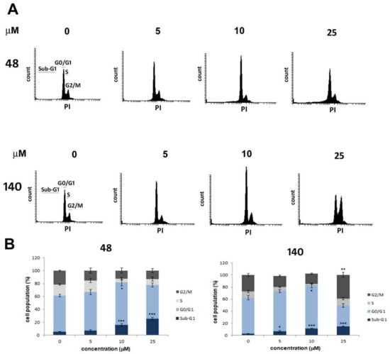 Cell cycle arrest in MCF-7 cells induced by compounds 48 and 140. Cells were treated with the indicated concentrations of the compounds, and the cell cycle distribution was analyzed with flow cytometry. (A) Histograms showing the distribution of cell populations in the sub-G1, G0/G1, S and G2/M phases of the cell cycle. (B) Graphs demonstrating the percentages of cells in the depicted phases of the cell cycle. Values represent the mean ± SD of three independent experiments. Data were analyzed by one-way ANOVA with Tukey’s post hoc test [p < 0.05 (*), p < 0.01 (**), p < 0.001 (***)].