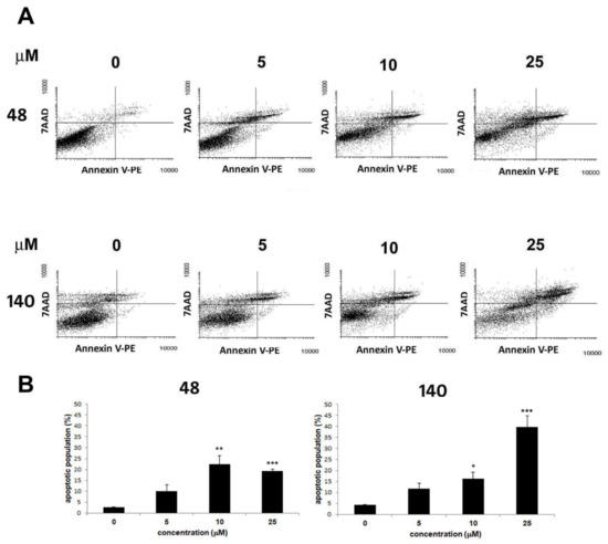 Induction of apoptosis by compounds 48 and 140 in MCF-7 cells. Cells were treated with the indicated concentrations of compounds 48 and 140 for 72 h, stained with Annexin V-PE and 7-AAD and analyzed with flow cytometry. (A) Dot plots showing early apoptotic (bottom right quadrant), late apoptotic (upper right quadrant), viable (lower left quadrant) and necrotic cell populations (upper left quadrant). (B) Graphs indicating early and late apoptotic cells. Values represent the mean ± SD of three repetitions. Data were analyzed by one-way ANOVA with Tukey’s post hoc test [p < 0.05 (*), p < 0.01 (**), p < 0.001 (***)].