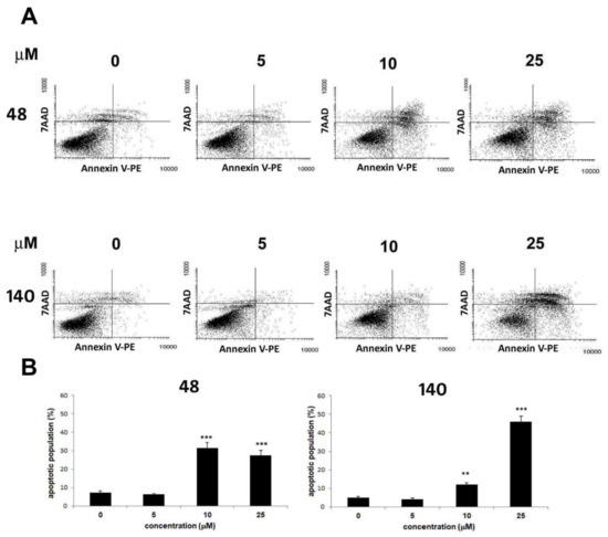 Induction of apoptosis by compounds 48 and 140 in T47D cells. Cells were treated with the indicated concentrations of compounds 48 and 140 for 72 h, stained with Annexin V-PE and 7-AAD, and analyzed with flow cytometry. (A) Dot plots showing early apoptotic (bottom right quadrant), late apoptotic (upper right quadrant), viable (lower left quadrant) and necrotic cell populations (upper left quadrant). (B) Graphs indicating early and late apoptotic cells. Values represent the mean ± SD of three repetitions. Data were analyzed by one-way ANOVA with Tukey’s post hoc test [p < 0.01 (**), p < 0.001 (***)].