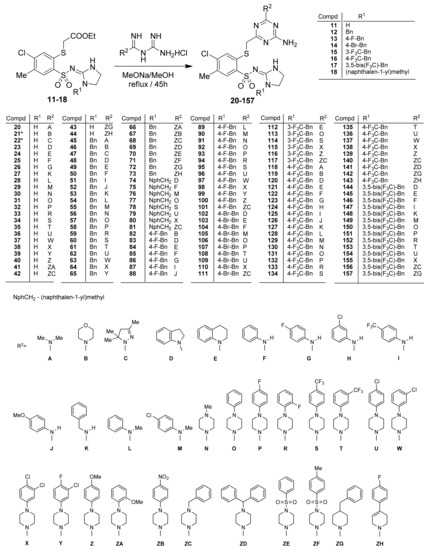 Aiming for the synthesis of the final 6-substituted 4-amino-1,3,5-triazin-2-yl derivatives 20–157 (Scheme 2) and 158–162 (Scheme 3), the esters 11–18 or 19 were reacted with the appropriate biguanide hydrochlorides [25,26,27,28,29,30] in MeONa/MeOH solution at reflux for 45 h.