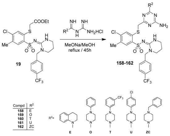 Synthesis of 2-[(4-amino-6-R2-1,3,5-triazin-2-yl)methylthio]-N-{1-[4-(trifluoromethyl)benzyl]tetrahydropyrimidin-2(1H)-ylidene}-4-chloro-5-methylbenzenesulfonamides (158–162).