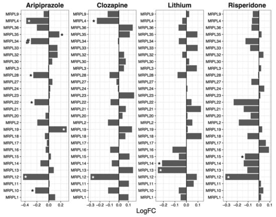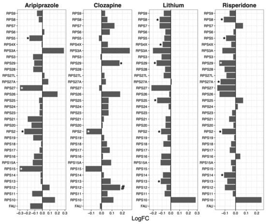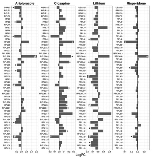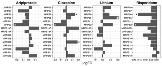 | Aripiprazole | Ribosome | 127 | −1.54 | 0.0041 | 0.033 |