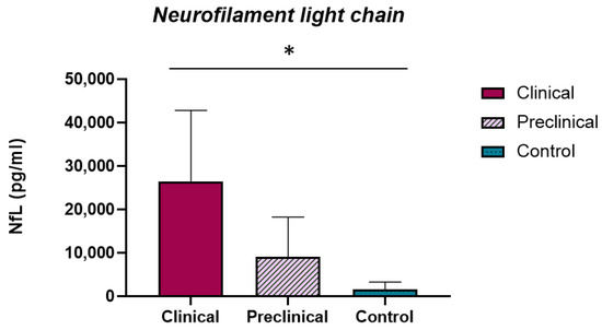 - Gaetani, L.; Blennow, K.; Calabresi, P.; Di Filippo, M.; Parnetti, L.; Zetterberg, H. Neurofilament light chain as a biomarker in neurological disorders. J. Neurol. Neurosurg. Psychiatry 2019, 90, 870–881. [Google Scholar] [CrossRef]