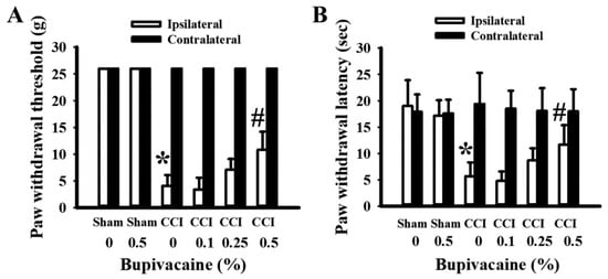 Bupivacaine alleviated mechanical allodynia and thermal hyperalgesia in CCI rats. Rats were intrathecally injected with the indicated concentrations of bupivacaine (0–0.5%, diluted in saline) for 30 min prior to being subjected to sham and CCI operation. Seven days later, mechanical allodynia (A) and thermal hyperalgesia (B) were evaluated in the ipsilateral and contralateral limbs. * p < 0.05 vs. sham/saline/ipsilateral group and # p < 0.05 vs. CCI/saline/ipsilateral group, n = 6.