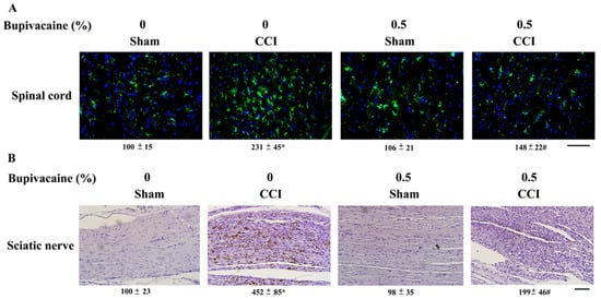 Bupivacaine alleviated microglia immunoreactivity in CCI rats. Rats were intrathecally injected with the indicated concentrations of bupivacaine (0 and 0.5%, diluted in saline) for 30 min prior to being subjected to sham and CCI operation. Seven days later, frozen sections of ipsilateral spinal cords (L4–L6) (A) and paraffin sections of ipsilateral sciatic nerves (B) were prepared and subjected to immunohistochemistry with antibodies recognizing CD68. Scale bar: 50 μm. Representative photomicrographs show immunoreactivity visualized with FITC fluorescence ((A), counterstained with Hoechst 33342) and diaminobenzidine ((B), counterstained with hematoxylin), respectively. Relative intensity of immunoreactivity was measured and depicted under photomicrographs (%). * p < 0.05 vs. sham/saline group and # p < 0.05 vs. CCI/saline group, n = 3.