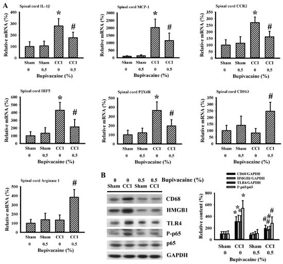 Bupivacaine alleviated inflammatory responses in the spinal cords of CCI rats. Rats were intrathecally injected with the indicated concentrations of bupivacaine (0 and 0.5%, diluted in saline) for 30 min prior to being subjected to sham and CCI operation. Seven days later, ipsilateral spinal cord dorsal horns (L4–L6) were collected and subjected to quantitative RT-PCR for the measurement of IL-1β, MCP-1, CCR2, IRF5, P2X4R, CD163, and arginase 1 mRNA expression (A). Protein content of CD68, HMGB1, TLR4, P-p65, p65, and GAPDH was measured in the ipsilateral spinal cord dorsal horns (L4–L6) using Western blotting. Representative blots and quantitative results are shown (B). * p < 0.05 vs. sham/saline group and # p < 0.05 vs. CCI/saline group, n = 6.