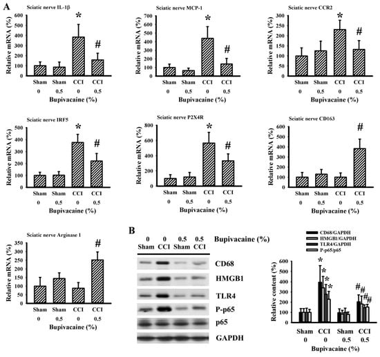 Bupivacaine alleviated inflammatory responses in the sciatic nerves of CCI rats. Rats were intrathecally injected with the indicated concentrations of bupivacaine (0 and 0.5%, diluted in saline) for 30 min prior to being subjected to sham and CCI operation. Seven days later, ipsilateral sciatic nerve tissues were collected and subjected to quantitative RT-PCR for the measurement of IL-1β, MCP-1, CCR2, IRF5, P2X4R, CD163, and arginase 1 mRNA expression (A). Protein content of CD68, HMGB1, TLR4, P-p65, p65, and GAPDH was measured in the ipsilateral sciatic nerve tissues using Western blotting. Representative blots and quantitative results are shown (B). * p < 0.05 vs. sham/saline group and # p < 0.05 vs. CCI/saline group, n = 6.