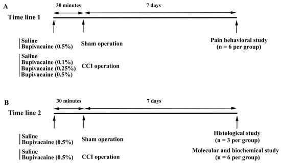 The sciatic nerve CCI model was produced in adult male Sprague-Dawley rats (age 8 weeks) according to reported procedures [,,]. All experimental procedures were performed following the approval of The Animal Experimental Committee of Taichung Veterans General Hospital (IACUC approval code: La-1051415, IACUC approval date: 23 November 2016). Rats (BioLASCO Taiwan Co., Ltd., Taipei, Taiwan) were housed in a standard conditioned animal facility with free access to rat chow and tap water. Under isoflurane anesthesia (2–4%), muscles on the right inguinal region were gently separated and the sciatic nerve exposed at mid-thigh level without stretching muscles and nerves. Proximal to the sciatic trifurcation, the nerve was loosely tied with four ligatures using 4–0 chromic catgut approximately 1.0 mm apart. Slight depression of the nerve was appropriate for ligation intensity. The muscles and skin were then sutured and disinfected, and the rats returned to cages. For sham operations, all steps remained the same except for sciatic nerve ligation. Intrathecal bupivacaine administration was performed 30 min prior to both the sham and CCI operations. A needle was inclined to an angle of approximately 30° and then inserted into the intervertebral space. A successful piercing of the dura was evidenced by a reflexive swing of the tail. Saline and bupivacaine were delivered through a 30-gauge sterile needle inserted vertically into the L5–L6 vertebrae at a volume of 15 microliters, followed by an additional 15 microliters of saline, as performed in a previously reported method []. For pain behavior study, rats were allocated into six groups (n = 6 per group): sham group receiving saline, sham group receiving bupivacaine (5 mg/mL, 0.5%), CCI group receiving saline, and 3 CCI groups receiving bupivacaine (1 mg/mL (0.1%), 2.5 mg/mL (0.25%), and 5 mg/mL (0.5%)). For molecular and biochemical study, rats were divided into four groups (n = 6 per group): sham group receiving saline, sham group receiving bupivacaine (5 mg/mL, 0.5%), CCI group receiving saline, and CCI group receiving bupivacaine (5 mg/mL, 0.5%). Because CCI in rodents caused severe pain behaviors on day 7 after surgery [,,], all animals were euthanized and subjected to further analyses 7 days after surgical procedures were performed (Figure 5).