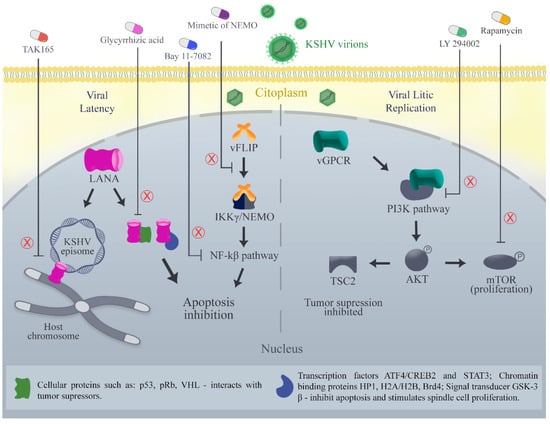 Therapeutics targets in signaling pathways modulated by Kaposi sarcoma-associated virus (KSHV) oncoproteins. The pathways shown include PI3K/Akt/mTOR associated with vGPCR (lytic oncoprotein), NF-kB associated with vFLIP (latency oncoprotein), and different pathways associated with LANA (latency oncoprotein). A total of 5 therapies are represented outside the cell and their respective targets are indicated with the letter “X” in red color.