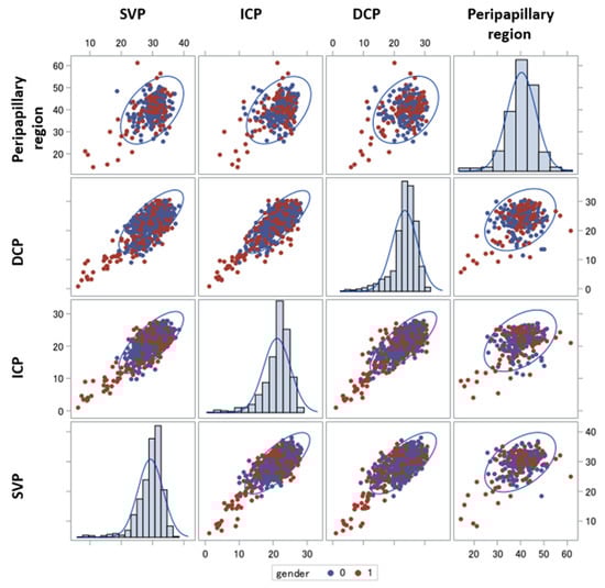 Vessel density differences in patients with Long COVID regarding gender. Relations between vessel density (SVP, ICP, DCP and peripapillary region) of patients with Long COVID (LC) colored by gender (male, blue; female, red), with 95% prediction ellipse; female patients with LC showed lower VD data; SVP—superficial vascular layer; ICP—intermediate capillary plexus; DCP—deep capillary plexus.