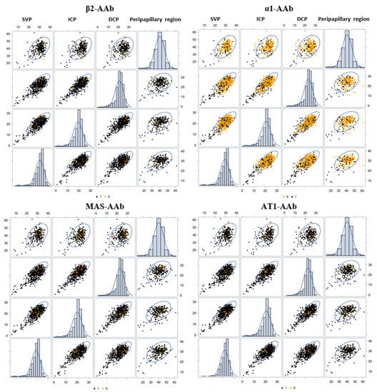Vessel density in relation to seropositivity and seronegativity of specific autoimmune antibodies. Association between the vessel densities of the SVP, ICP, DCP, and peripapillary region of patients with Long COVID considering a seropositivity of β2-AAb, α1-AAb and MAS-AAb with the 95% prediction ellipse. Black = Seropositivity (1), Yellow = Seronegativity (0); SVP—superficial vascular layer; ICP—intermediate capillary plexus; DCP—deep capillary plexus.
