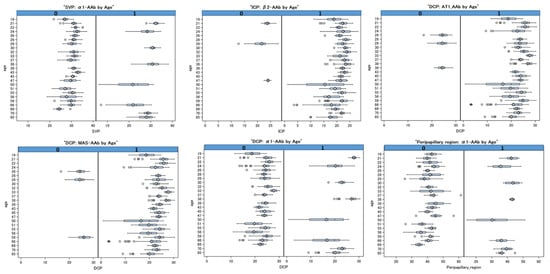 In Figure 3, the age’s trend is represented for the VD of the SVP, DCP, ICP and peripapillary region, respectively. It is divided into two panels for the seropositivity and seronegativity for each significant GPCR-AAb. The different box plots underline the different trends among the covariate age, taking into account all the repetitions. Seropositivities for MAS-AAb, β2-AAb, AT1-AAb, and α1-AAb were observed in all analyzed patients’ age groups (19–85 years) with a significant negative trend (p < 0.05). All the age variable estimations are presented in Supplementary Table S1.