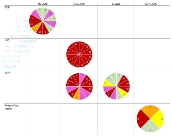 Schematic color-coded sketch of the number of significant interactions: sectorial vessel density of SVP, ICP, DCP (n = 12), and peripapillary region (n = 4) is presented considering the effect of the M2-AAb, Noci-AAb, β2-AAb, and ETA-AAb; red, n ≥ 8; pink, n = 6–7; orange, n = 5; yellow, n = 4; green, n = 2–3; gray, n = 0–1; SVP—superficial vascular plexus of the macula; ICP—intermediate capillary plexus of the macula; DCP—deep capillary plexus of the macula.
