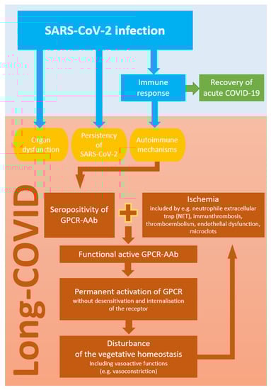 Schematic hypothesis of GPCR-AAb-mediated autoimmunity in Long COVID: a seropositivity of GCPR-AAb and ischemia might induce a vicious circulus.