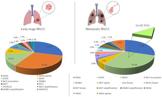 In the localized, early-stage LUAD, the most prevalent mutations are KRAS mutations (29.1%) followed by EGFR (14.2%) mutations, as shown in Figure 1. Yet, the incidence of EGFR mutations doubles in metastatic disease (to around 30.3%), while the frequency of KRAS mutations remains constant (around 29%). Compared to early-stage disease, metastatic NSCLCs are significantly more heterogeneous, and additional driver mutations, of which the frequency is higher than 1%, have been detected in around 10% of patients. These additional drivers include ALK, ROS1, RET fusions, and MET splice mutations, which were shown to be negatively correlated with KRAS mutations. Yet, the range of enriched genomic co-alterations in advanced EGFR-mutant LUAD in majority includes recurrent mutations in TP53 (54.6–64.6%), RB1 (9.6–10.33%), CTNNB1 (5.3–9.6%), and PIK3CA (9–12.4%) [].