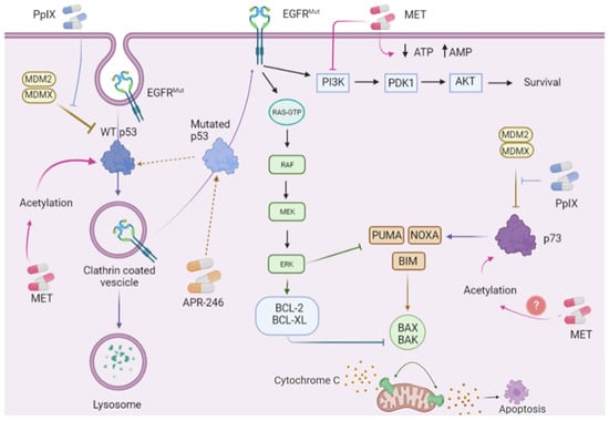 Reactivation of p53 protein family for improved therapy in EGFR-mutated (EGFRmut) lung cancer. Targeted drugs or repurposed drugs that reactivate p53 proteins in EGFR-mutated malignancies are promising candidates for improved cancer therapy. APR-246 (eprenetapopt) refolds mutant p53 to wild-type conformation and might induce lysosome-mediate degradation of mutant EGFR protein (EGFRmut). At the same time, repurposed protoporphyrin IX (PpIX) and metformin (MET) might promote reactivation of wild-type p53 and p73 by inhibiting their interactions with MDM2 and MDMX or activating acetylation of p53 and p73 respectively. The reactivation of both tumor suppressor proteins might enhance apoptosis induction in the presence of EGFRmut. In addition, it might be foreseen that metformin-mediated inhibition of EGFR-PI3K—AKT pathway will further enhance the response of EGFR-mutated cancer cells to the treatment.