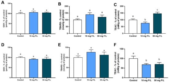 Likewise, the exposure of offspring to F was not able to promote significant changes in thiobarbituric acid reactive substances (TBARS) levels in the parotid glands (Control: 100 ± 15.28%; 10 mg F/L: 138.90 ± 30.21%; 50 mg F/L: 120.44 ± 34.10%; p < 0.05; Figure 1B) and submandibular glands (Control: 100 ± 16.42%; 10 mg F/L: 126.15 ± 28.13%; 50 mg F/L: 112.64 ± 31.55%; p < 0.05; Figure 1E).