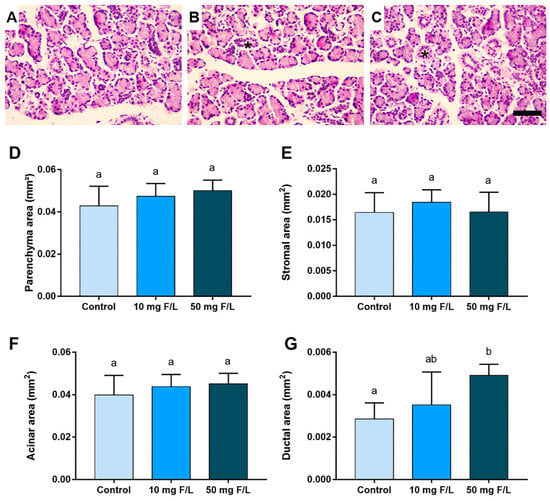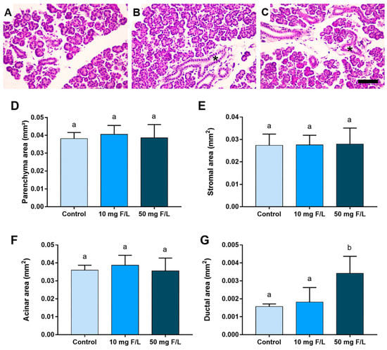 Morphometric analysis of the tissues that comprise the submandibular glands of the offspring indirectly exposed to water containing 0 (control), 10, or 50 mg F/L for 42 days (n = 5 animals/group). (A–C) represent the submandibular glands of the control, 10 and 50 mg F/L groups, respectively; in (D), parenchyma area (mm2); in (E), stromal area (mm2); in (F), area of acini (mm2); in (G), duct area (mm2). Quantitative results are expressed as mean ± standard error, one-way ANOVA with Tukey’s post-test. Different letters indicate statistical difference (p < 0.05). The asterisk indicates the location of the ducts. Scale bars: 10 μm.