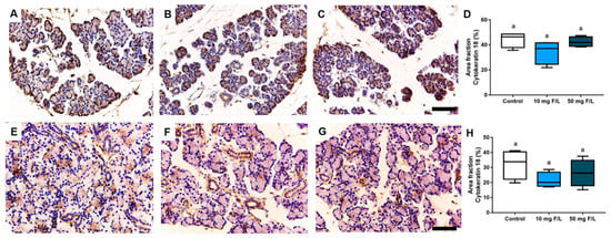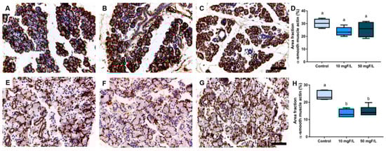The evaluation of samples immunostained with the anti-α-smooth muscle actin (α-SMA) antibody showed no significant differences among groups control, 10 mg F/L and 50 mg F/L in the offspring’s parotid glands (Figure 5D) (p > 0.05). However, for the area fraction values obtained by analyzing the actin filaments present in myoepithelial cells of the submandibular gland, no significant difference was noted between the exposed groups (10 and 50 mg F/L; Figure 5H) (p < 0.05).