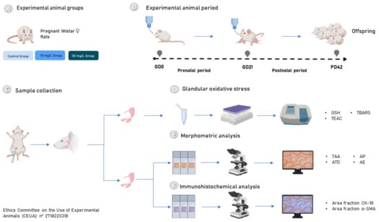 Overview of the experimental protocol. In (A), division of the rats into the experimental groups; in (B), developmental stages of the rats and their offspring before sample collection; in (C), collection of PA and SM glands; in (D), evaluation of glandular oxidative stress; in (E), morphometric analysis of the salivary glands and in (F), immunohistochemical analysis of the samples.