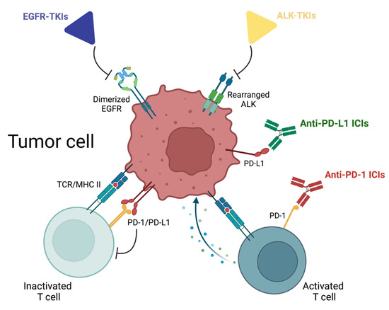 Mechanisms of action of main drugs evaluated in the adjuvant and neoadjuvant setting in NSCLC patients (created with BioRender.com (accessed on 15 June 2022)). Abbreviations: EGFR, Epidermal Growth Factor Receptor; ALK, Anaplastic Lymphoma Kinase; TKIs, tyrosine kinase inhibitors; PD-(L)1, Programmed death-(ligand) 1; ICIs, immune checkpoint inhibitors; TCR, T-cell receptor; MHC II, major histocompatibility complex.