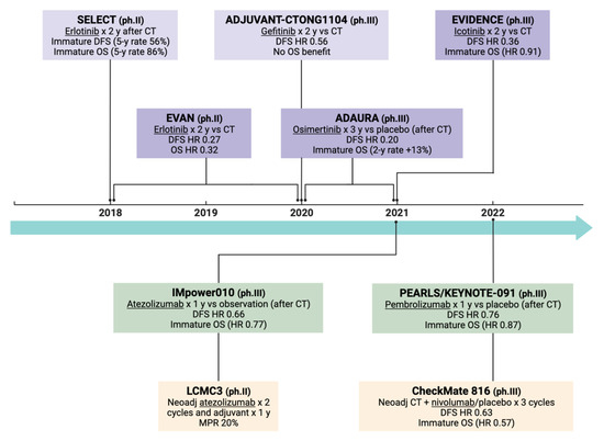 Main clinical trials in the adjuvant/neoadjuvant setting with EGFR-TKIs and ICIs with available literature data (created with BioRender.com (accessed on 15 June 2022)). Abbreviations: y, years; CT, chemotherapy; DFS, disease-free survival; OS, overall survival; neoadj, neoadjuvant; MPR, major pathological response; EGFR-TKIs, Epidermal Growth Factor Receptor tyrosine kinase inhibitors; ICIs, immune checkpoint inhibitors.