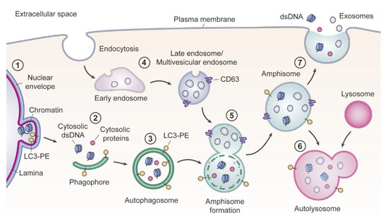 Jeppesen et al. model of amphisome-dependent, exosome-independent secretion. For autophagy, cytosolic LC3 is lipidated by conjugation with phosphatidylethanolamine to form LC3-PE. (1) Nuclear membranes can bleb in a process dependent on LC3B and the nuclear lamina protein Lamin B1, causing the appearance of cytoplasmic chromatin fragments. (2) During autophagy, cytoplasmic components are sequestered as a phagophore begins to engulf material. (3) Continued expansion of autophagic membranes requires LC3-PE and results in formation of the double-membrane autophagosome. (4) As early endosomes develop to late endosomes, the pH decreases and continued invagination of limiting membranes generates intraluminal vesicles (ILVs). A fully developed CD63-positive multivesicular endosome (MVE) contains numerous ILVs. (5) Fusion of the autophagosome with a MVE causes degradation of the inner autophagosome membrane, generating an amphisome, a single-membrane hybrid compartment. (6) The amphisome fuses with a lysosomal compartment to form the autolysosome followed by degradation of cargo, or alternatively, (7) the amphisome fuses with the plasma membrane causing extracellular release of dsDNA and histones, and separately, the ILVs as exosomes. Reprinted with permission from Ref. [31]. Copyright 2019, with permission from Elsevier.
