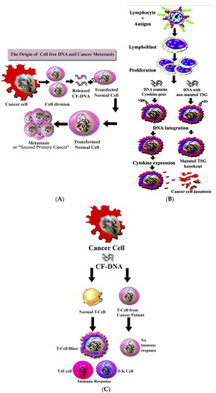 (A) The origin of cf-DNA and cancer metastasis. Cancer cells release DNA when they divide. The released DNA (cf-DNA) circulates in the body fluids and has the ability to transfect and transform adjacent or remote normal cells. The transformed cells may keep growing, and so cancer metastases or second primary cancer develops. (B) Hypotheses of two possible outcomes if the lymphocyte DNA transfects cancer cells. If this DNA contains cytokine’s functional coding region, the transfected cancer cells may become cytokine releasing cells and, in some cases, may work like an intrinsic cancer vaccine releasing therapeutic cytokine (left). If this DNA contains a coding region for a nonmutated oncogene or tumor suppressor gene, a homologous DNA recombination may cause knock out of a correspondent mutated oncogene or tumor suppressor gene that may lead to cancer cell apoptosis, and thus a dramatic spontaneous remission of the cancer may ensue (right). (C) Hypotheses of two possible effects of cancer cf-DNA on lymphocytes. If the lymphocyte contains the functional DNA receptor, cancer cf-DNA binding to the receptor may activate the lymphocyte, thus forming lymphoblasts that proliferate and differentiate into immune responding cells (e.g., helper-T cells or killer-T cells) to enhance immune function (left). If the lymphocyte contains no functional DNA receptor, the cf-DNA has no effect on the lymphocyte without any change in immune response (right) [81]. Copyright 2005, with permission from Elsevier.