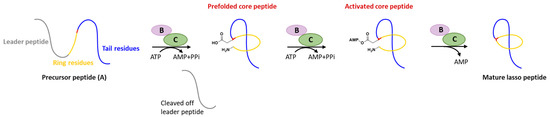 Generally, at least three gene products are involved in the biosynthesis of lasso peptides: a precursor peptide (A), an ATP-dependent cysteine protease (B), and an ATP-dependent macrolactam synthetase (C). The ribosome-derived linear precursor peptide consists of an N-terminal leader region for the recognition by different PTM enzymes and a C-terminal core region that makes up the structural backbone of lasso peptides. The cysteine protease (B) encompasses a ribosomal recognition element (RRE) domain in the N-terminus to recognize and bind the leader peptide, after which the C-terminal protease domain cleaves the leader peptide to release the leaderless core peptide (prefolded core peptide in Figure 1). In many cases, the N-terminal RRE and the C-terminal protease domains are split into two separate open reading frames (ORFs) termed B1 (RRE) and B2 (cysteine protease), respectively. The nascent core peptide is further delivered to macrolactam cyclase C that uses ATP to activate the side carboxyl of Asp or Glu located at 7–9 as an AMP ester (activated core peptide in Figure 1), followed with the freely N-terminal α-amine attacking the AMP-activated carboxyl group to form an isopeptide bond and achieve the mature lasso peptide (Figure 1). It is very likely that the C-terminal tail of the core peptide is prefolded into the threaded configuration prior to the ring’s closure, otherwise the tail would be excluded by the macrolactam owing to the steric hindrance and unable to form the correct lasso topology. Extra D genes encoding ATP-binding cassette transporters (ABC transporters) are not rare in the biosynthetic gene clusters (BGCs) of lasso peptides and are believed to be responsible for the extracellular transport of mature lasso peptides [3,4,5,6,7].