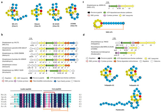 - Arnison, P.G.; Bibb, M.J.; Bierbaum, G.; Bowers, A.A.; Bugni, T.S.; Bulaj, G.; Camarero, J.A.; Campopiano, D.J.; Challis, G.L.; Clardy, J.; et al. Ribosomally synthesized and post-translationally modified peptide natural products: Overview and recommendations for a universal nomenclature. Nat. Prod. Rep. 2013, 30, 108–160. [Google Scholar] [CrossRef] [PubMed]