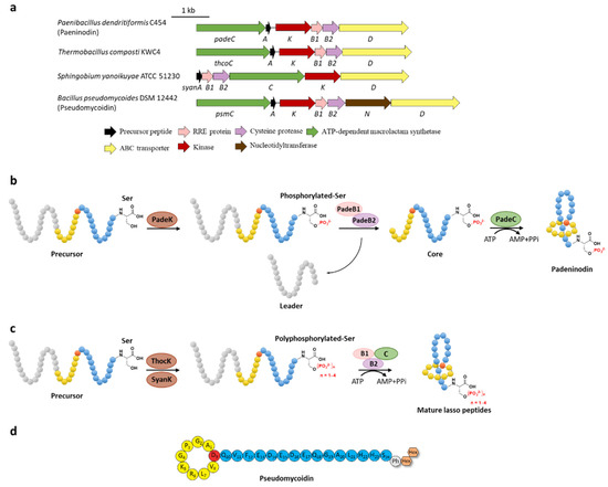 - Zhu, S.; Hegemann, J.D.; Fage, C.D.; Zimmermann, M.; Xie, X.; Linne, U.; Marahiel, M.A. Insights into the unique phosphorylation of the lasso peptide paeninodin. J. Biol. Chem. 2016, 291, 13662–13678. [Google Scholar] [CrossRef]