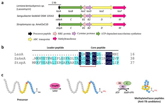 To understand the biosynthetic pathway of the methylated lasso peptide, two lassomycin-like BGCs from Sanguibacter keddieii DSM 10542 (sake) and Streptomyces sp. Amel2xC10 (stsp) containing predicted O-methyltransferase genes (sakeM and stspM) were identified by genome mining (Figure 4a,b). StspM is a novel methyltransferase that specially modified the C-terminal carboxyl of the precursor peptide with a broad substrate specificity, leading the formation of C-terminal methyl carboxylate to precede the maturation process catalyzed by RRE (B1 protein), peptidase (B2 protein), and macrolactam cyclase (C protein) in the lasso peptide biosynthetic pathway (Figure 4c) [31]. Based on homology modeling with mitomycin-7-O-methyltransferase [32] and mutational analysis, His242 and Glu296 were validated as the catalytic center of StspM [31]. Considering the rare O-methyltransferases involved in the biosynthesis of lassomycin and two potential lassomycin-like peptides, the biosynthetic mechanism of lassomycin is speculated to follow the same pathway, and the lassomycin-like lasso peptides display identical formability to be candidates for anti-TB drugs.