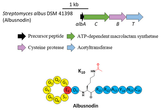The BGC and structure of albusnodin. The acetyl group attached to the ε-amino of K10 is highlighted in red.