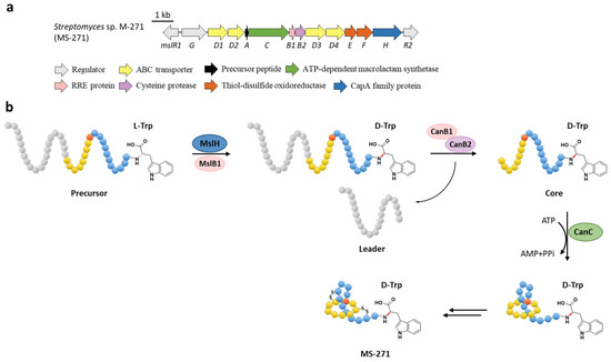 The BGC (a) and proposed biosynthetic pathway (b) of MS-271. MslH epimerizes the C-terminal Trp residue of precursor peptide with the aid of MslB1, similar to the cooperation of CanE and CanB1 in Section 6.