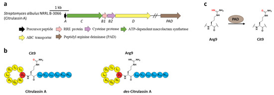 Citrullination, referring to Arg deimination to produce non-proteinogenic amino acid citrulline (Cit), had never been reported in RiPPs until the lasso peptide citrulassin A was discovered from S. albulus NRRL B-3066 using the Rapid ORF Description and Evaluation Online (RODEO) genome-mining tool. The conversion of Arg9, which is invariable among the citrulassin family, to Cit was certified by in silico analysis of the precursor peptide sequence and nuclear magnetic resonance (NMR) analysis of the maturated citrulassin A (Figure 8b). Heterologous expression of the citrulassin A cluster with ~20 kb upstream and downstream regions only produced des-citrulassin A with unmodified Arg9, suggesting the enzyme responsible for citrulline generation is remotely encoded in the genome [22].