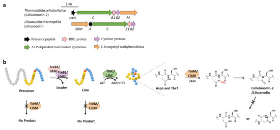 Protein l-isoaspartyl methyltransferases (PIMTs) usually have a crucial role in protein repair, recognizing and repairing abnormal isoaspartate (isoAsp) residues to l-Asp through a SAM-dependent methyl esterification reaction [58]. In total, 48 lasso peptide BGCs were uncovered bearing genes annotated as O-methyltransferases that belong to PIMT homologues, and the extremely conserved Asp6 in all the putative precursor peptides suggested that it might be the modification site [59]. Heterologous expression of two clusters from actinobacterium Thermobifida cellulosilytica (tce) and firmicute Lihuaxuella thermophila (lih) (Figure 9a) resulted in the discovery of cellulonodin-2 and lihuanodin, featuring an unconventional succinimide moiety (also known as aspartimide) in the macrolactam ring. It was experimentally proved in vitro that TceM and LihM catalyzed the methylation of Asp6 to the corresponding methyl ester, followed with spontaneous nucleophilic attack of the adjacent Thr7 amino group to form a stable succinimide moiety without further hydrolyzation. Notably, TceM and LihM carried out dehydration on Asp instead of isoAsp, which is in stark contrast to canonical PIMTs. In addition, both TceM and LihM only recognized the threaded lasso peptides rather than linear precursors or isopeptide-bonded rings (Figure 9b) [59].
