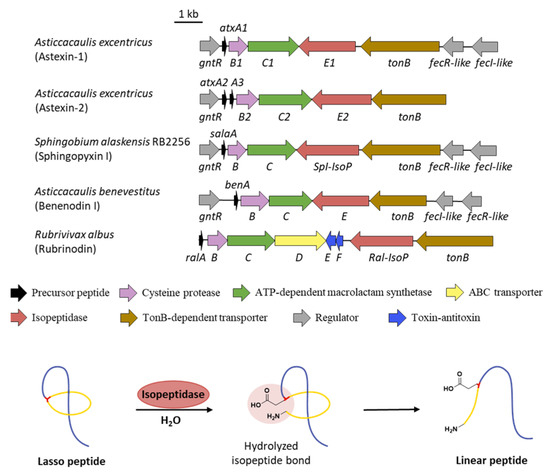 - Fage, C.D.; Hegemann, J.D.; Nebel, A.J.; Steinbach, R.M.; Zhu, S.; Linne, U.; Harms, K.; Bange, G.; Marahiel, M.A. Structure and mechanism of the sphingopyxin I lasso peptide isopeptidase. Angew. Chem. Int. Ed. 2016, 55, 12717–12721. [Google Scholar] [CrossRef] [PubMed]