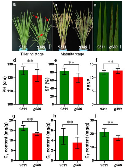 Characterization of the g380 mutant. (a) Plants of 9311 and g380 at the tillering stage. (b) Plants of 9311 and g380 at the maturity stage. (c) Leaves of 9311 and g380. (d–f) Agronomic traits of 9311 and g380 plants. PH, plant height; SF, spikelet fertility; PBNP, primary branch number per panicle. (g–i) The chlorophyll content of 9311 and g380 leaves. Bar = 10 cm in (a) and (b); red arrows point out lesions on g380 leaves in (a); bar = 1 cm in (c). ** represent p < 0.01 by Welch’s t-test.