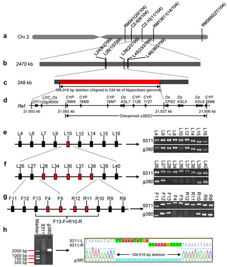 Fine mapping of g380. (a,b) Preliminary mapping interval. (c) Fine mapping interval; red area represents the deletion fragment. (d) Reference genes in the deletion area. (e–g) Process to determine the deletion area in g380; general view of the process is on the left, and the results of agarose gel electrophoresis are on the right. (h) Results of 9311 and g380 amplified with F13 forward primer and R10 reverse primer; the start and end sequences of the deleted fragments were obtained by sequencing. Red boxes in (e–g) represent the deletion area or primers in the deletion area.