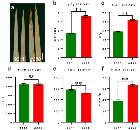 To further investigate the biochemical mechanisms of ROS accumulation, we measured the activities of catalase (CAT), peroxidase (POD), and total superoxide dismutase (T-SOD). The activity of T-SOD was significantly lower in g380 than in 9311, while CAT activity was significantly increased in g380 compared to 9311, the POD activity had no significant difference between 9311 and g380 (Figure 3c–e). Malondialdehyde (MDA) is produced and accumulated in the cell due to membrane lipid peroxidation. To determine the extent of membrane damage, we measured the content of MDA. MDA content was also significantly increased in g380 (Figure 3f). These results suggested that high-level ROS accumulated in g380 and the ROS scavenging enzyme system of g380 was disturbed.