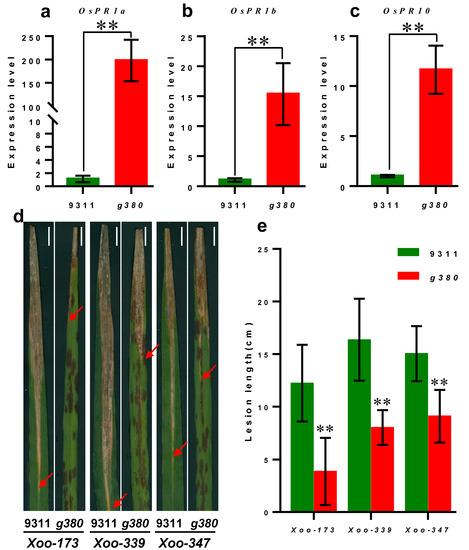 To examine whether the activated defense response would lead to enhanced disease resistance, three strains of Xanthomonas oryzae pv. oryzae (Xoo) were tested (Figure 4d,e). The lesion lengths on 9311 leaves were significantly longer than g380 after inoculation, which indicated that g380 exhibited enhanced resistance to Xoo.