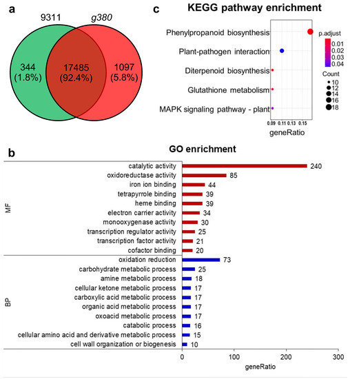 Expressed gene statistics and GO and KEGG pathway enrichment analysis of DEGs. (a) Venn diagram of 9311 and g380 expressed genes. (b) GO enrichment analysis of upregulated DEGs; the top ten terms enriched in BP and MF. BP: biological process; MF: molecular function. (c) KEGG pathway enrichment analysis of up-regulated DEGs.