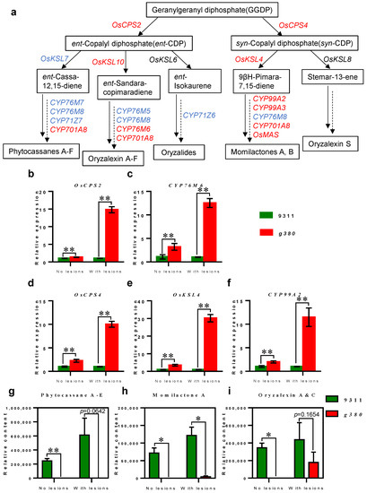 Decreased diterpenoid biosynthesis in g380 leaves. (a) Biosynthesis process of major diterpenoid phytoalexins in rice; substances in black bordered text boxes are metabolites; genes indicated in blue are deleted in g380, genes indicated in red are DEGs upregulated in g380, genes indicated in black have no significant difference in expression level between 9311 and g380. The solid arrows represent the direct response, and the “solid + dashed” arrows represent that the process has not been explained sufficiently clearly. (b–f) Expression of non-deleted diterpenoid biosynthetic genes in 9311 and g380 before and after the formation of g380 lesions; (b,c) display genes located on chromosome 2; (d–f) display genes located on chromosome 4; error bar represents ± SD; ** indicates p < 0.01 by Welch’s t-test. (g–i) Diterpenoid phytoalexin content in 9311 and g380 leaves before and after g380 lesion formation; error bar represents ± SE; * indicates p < 0.05, ** indicates p < 0.01 by Welch’s t-test.