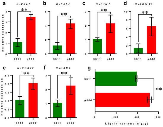 Increased lignin biosynthesis in g380. (a–f) The expression levels of lignin biosynthetic genes in 9311 and g380 leaves. (g) Lignin content in 9311 and g380 flag leaves. All data presented as mean value ± SD; hypothesis testing was performed with Welch’s t-test, n = 6, ** means p < 0.01.