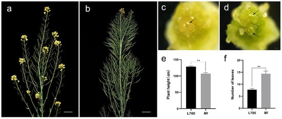 Compared with wild-type L780 parents, MI mutant has parallel main inflorescences (Figure 1) and the dividing nodes on the main stem are clearly visible. At the vegetative development stage, seedlings of MI mutant have more rosette leaves than wild-type L780 (Figure 1f and Figure S1). At the flowering stage, MI mutant exhibited lower plant height than that in L780 (Figure S2), and significant higher number of main inflorescence pods at maturity (Figure 1b). Moreover, the agronomic characters of single inflorescence and multi-inflorescence plants in BC4F1 population were measured, respectively. The proportion of main inflorescence yield is between 24.77% and 92.19%, and the range of single inflorescence is between 15.59% and 33.92%. The plant with the multiple inflorescences has more pods, while the pod length and number of grains per pod have little difference (Table S1). The multi-inflorescence traits therefore undoubtedly will provide the possibility of mechanized operation and yield increase.