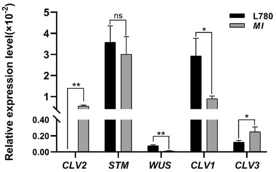 Relative expression of shoot apical meristem (SAM) development-related genes. Error bars indicate SD (* p < 0.05, ** p < 0.01, ns indicated no significant difference; Student’s t test).