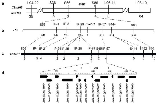 In previous study, BnaMI gene was mapped at the physical interval of 2.5 Mb on chromosome A05 of B. napus using Brassica 60K SNP BeadChip Array combined with molecular marker technology, L04−2 and L06−14 were the closest flanking markers []. To reveal the molecular mechanisms of the multi-inflorescence phenotype, simple-sequence repeat (SSR) markers were designed and BnaMI was further located on chromosome A05, an interval between markers S56 and S86 (Figure 3a), and corresponding to a 652 kb region of B. napus Darmor-bzh physical map. Using a larger BC4F1 population of 3487 plants, BnaMI was then fine-mapped to a 55 kb genomic region between intron polymorphism (IP) markers IP-29 and IP-57; two and four recombination events were detected for IP−29 and IP−57, respectively (Figure 3). The frequency distribution on multi-inflorescence traits in BC4F1 population was exhibited in Supplementary File S1 (Figure S3).
